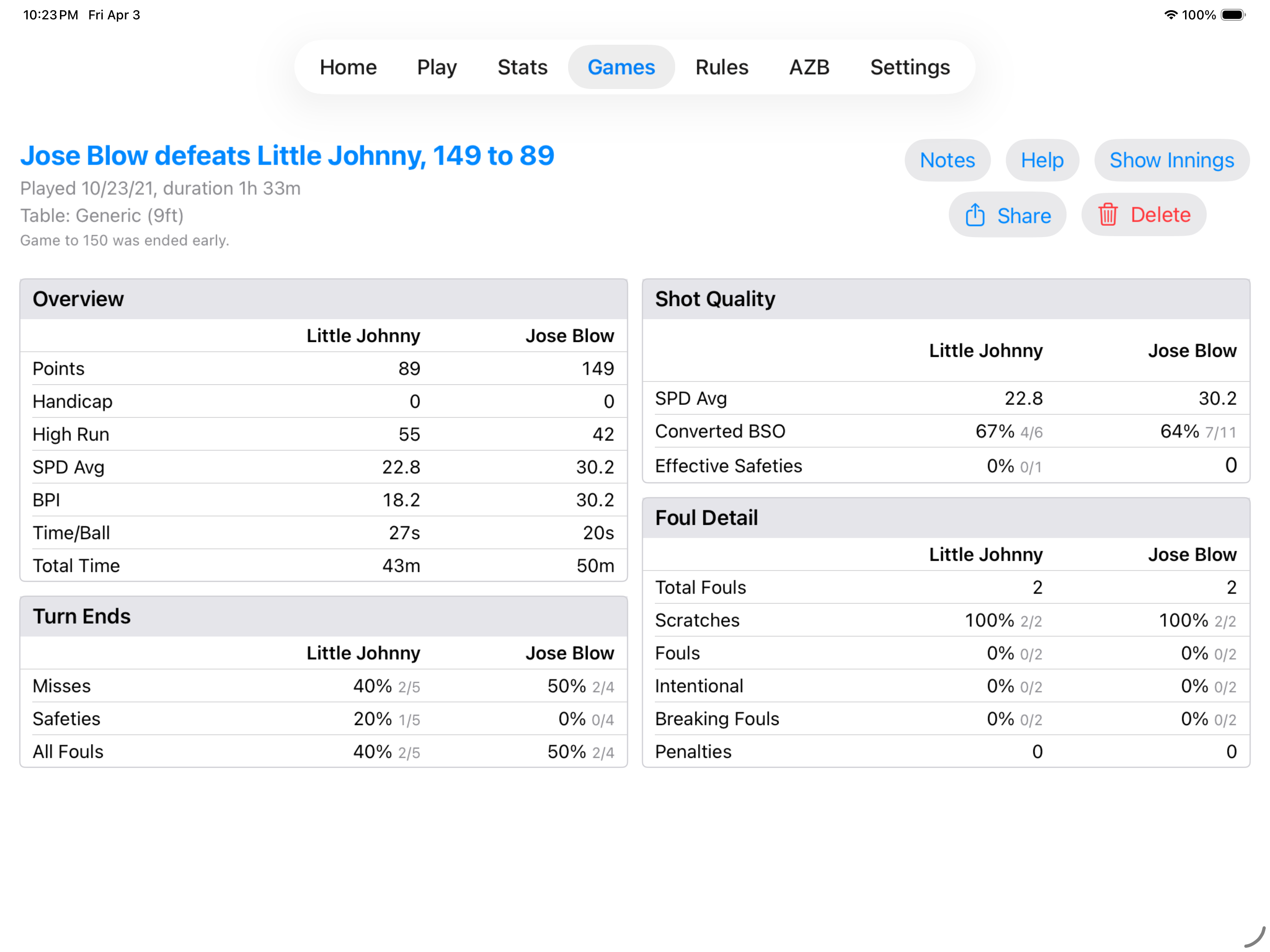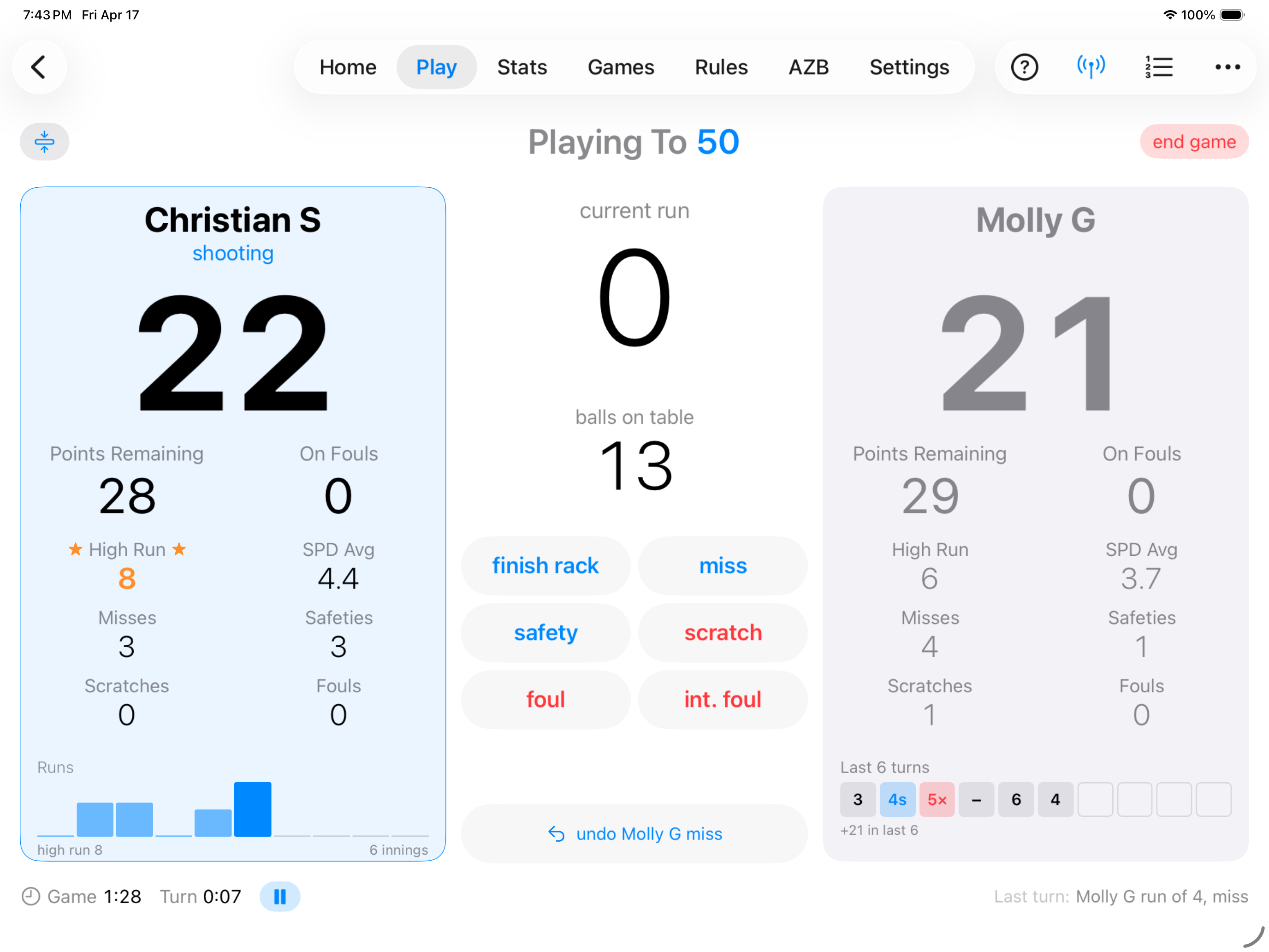 Every game saved with complete inning-by-inning history. High runs, average runs, fouls, scratches — the stats that matter in straight pool.